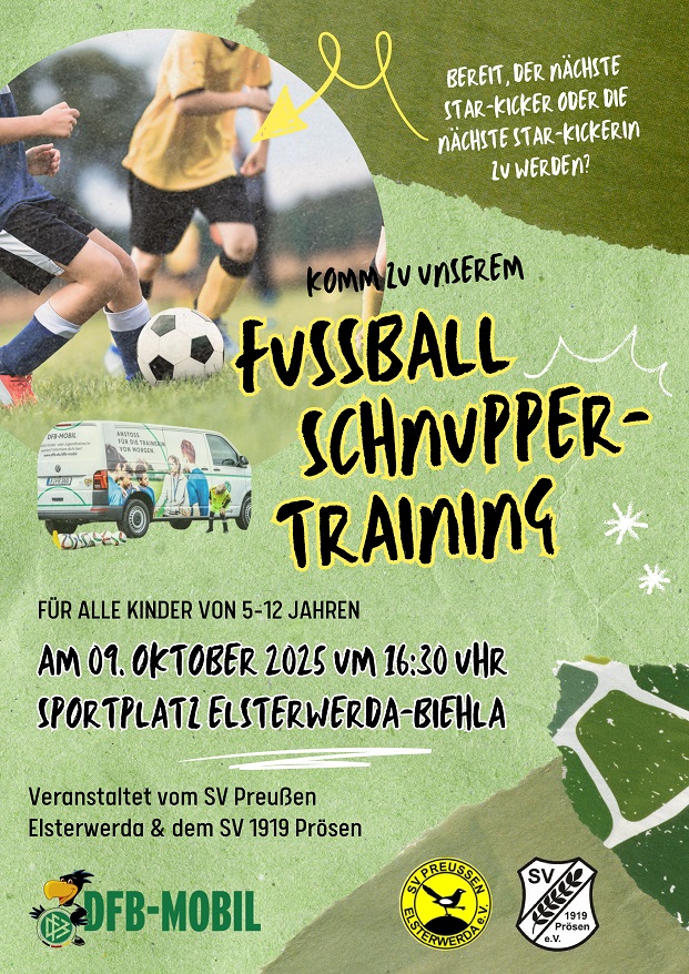 Komm zu unserem Fußball-Schnuppertraing am 09.10.205 um 16:30 Uhr auf dem Sportplatz in Elsterwerda-Biehla.